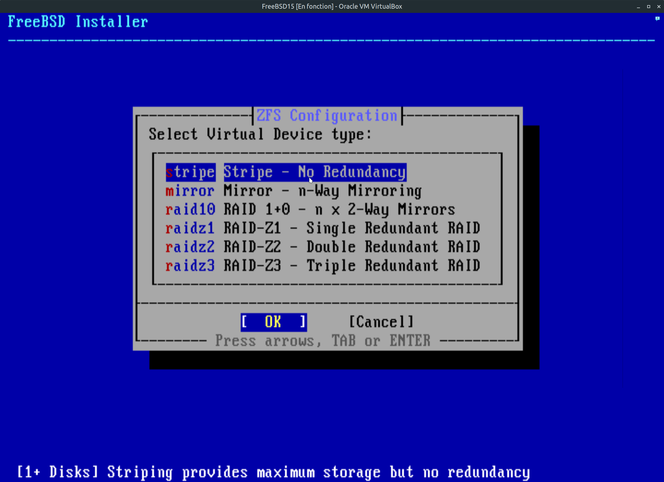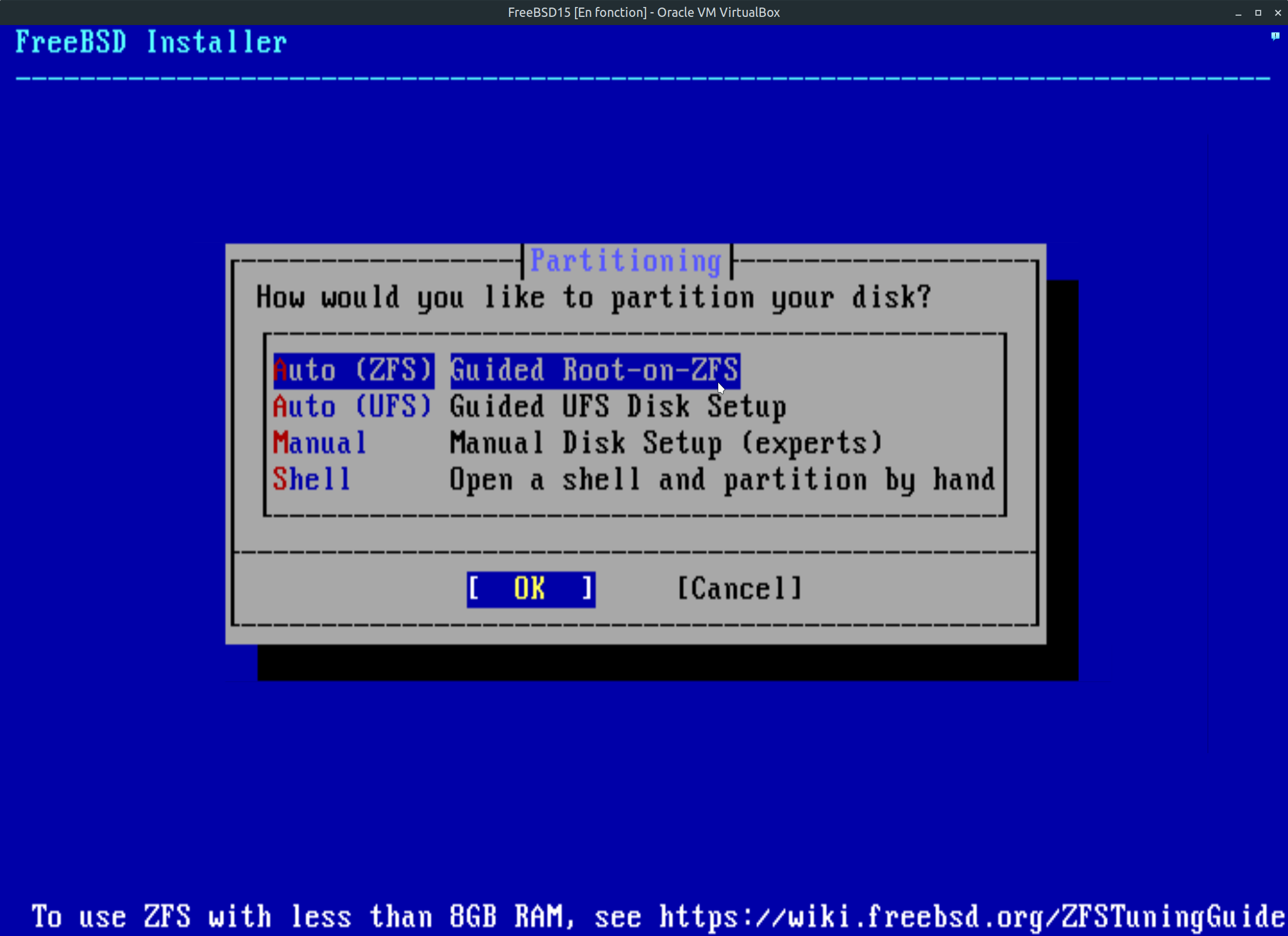 Étape 11: Nous voici à l'étape de partitionnement du disque dur. Le choix est simple, Auto (ZFS) est votre par défaut. Les autres choix sont destiné à des configurations particulières souvent utilisé par des experts au niveau serveur. Faite entrée sur le clavier pour continuer.