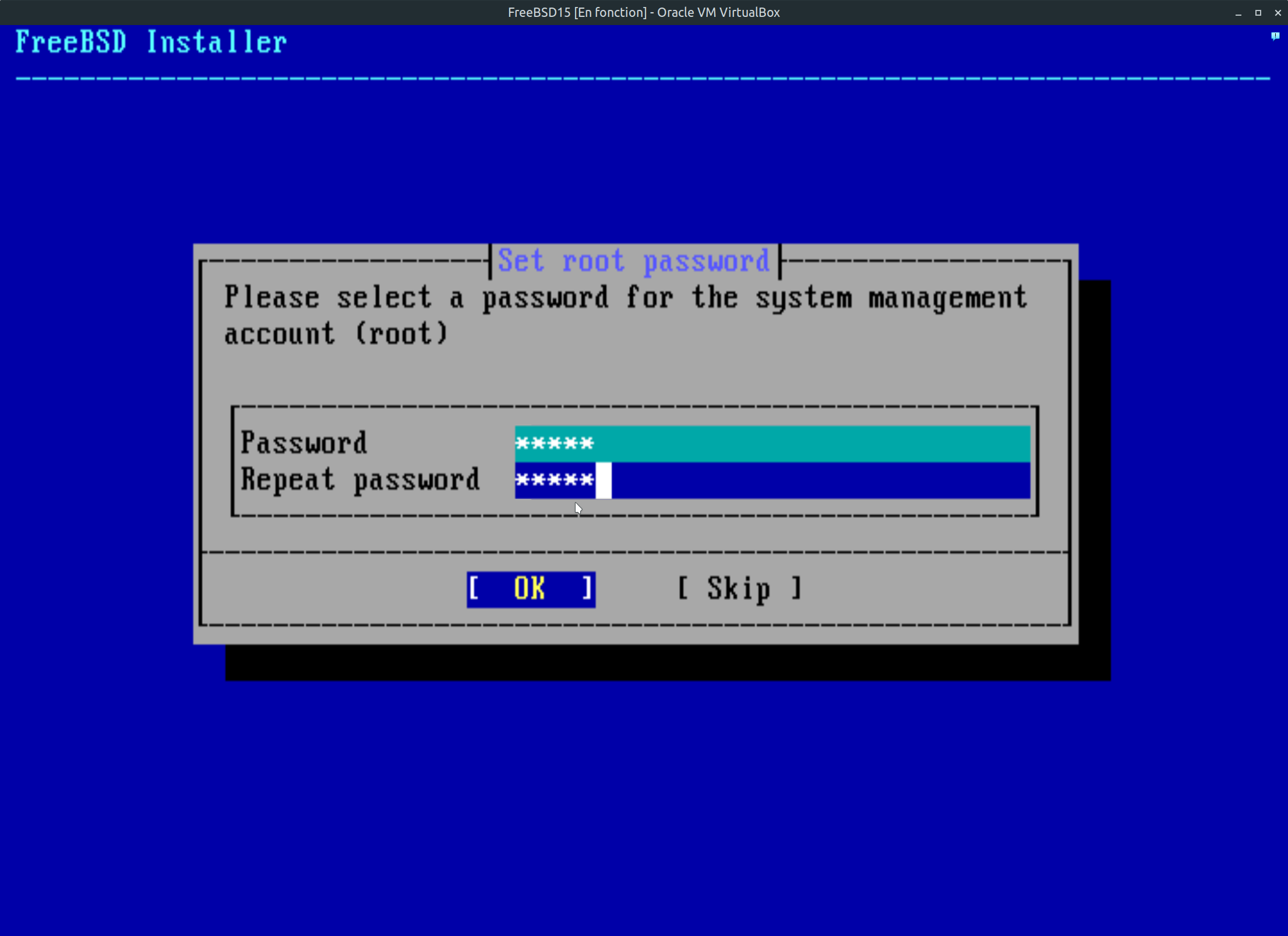Étape 17: L'étape de configuration et d'installation des paquets est terminé. Nous voici à l'étape de créer le mot de pas administrateur du système FreeBSD 15 fraîchement installé. A savoir: prenez note que dans le jargon freeBSD et Linux, le compte administrateur est appelé (root). Écrire votre mot passe et faite entrée sur votre clavier pour passer aux prochaines étapes du processus.