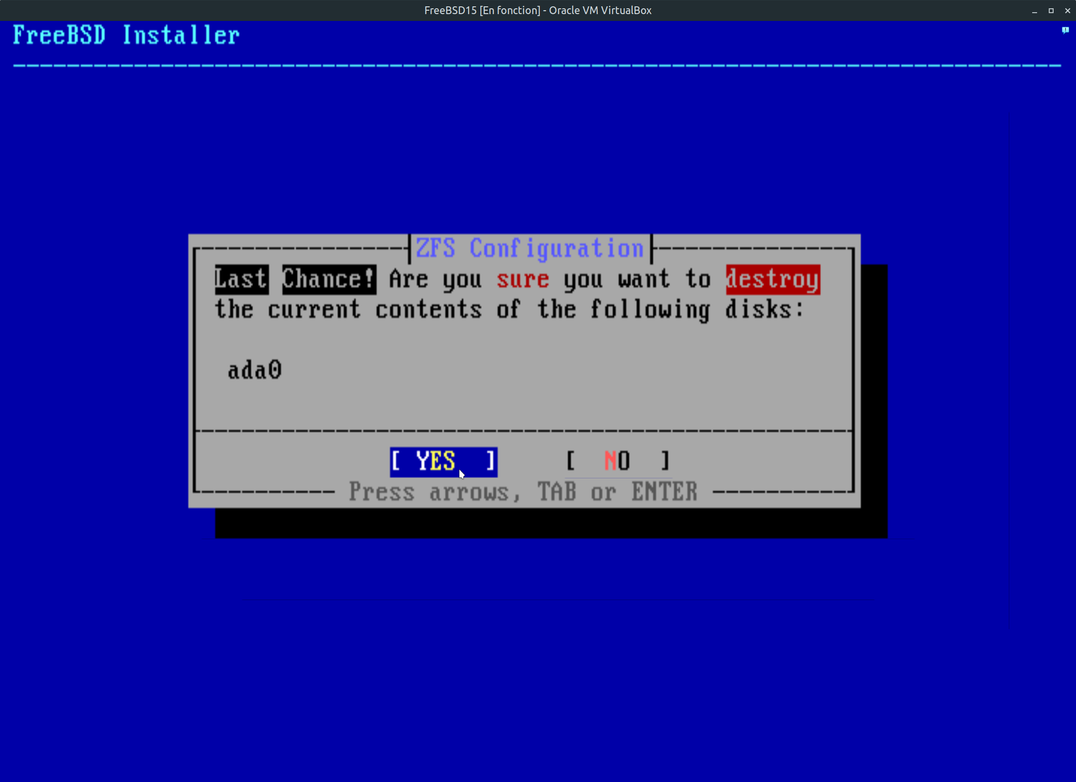 Étape 14: Nous voici à la dernière fenêtre contextuelle qui vous demande êtes vous certain de vouloir continué c'est votre dernière chance avec le formatage et le partitionnement du disque. Si vous êtes certain de votre choix, faite entrée sur le clavier.