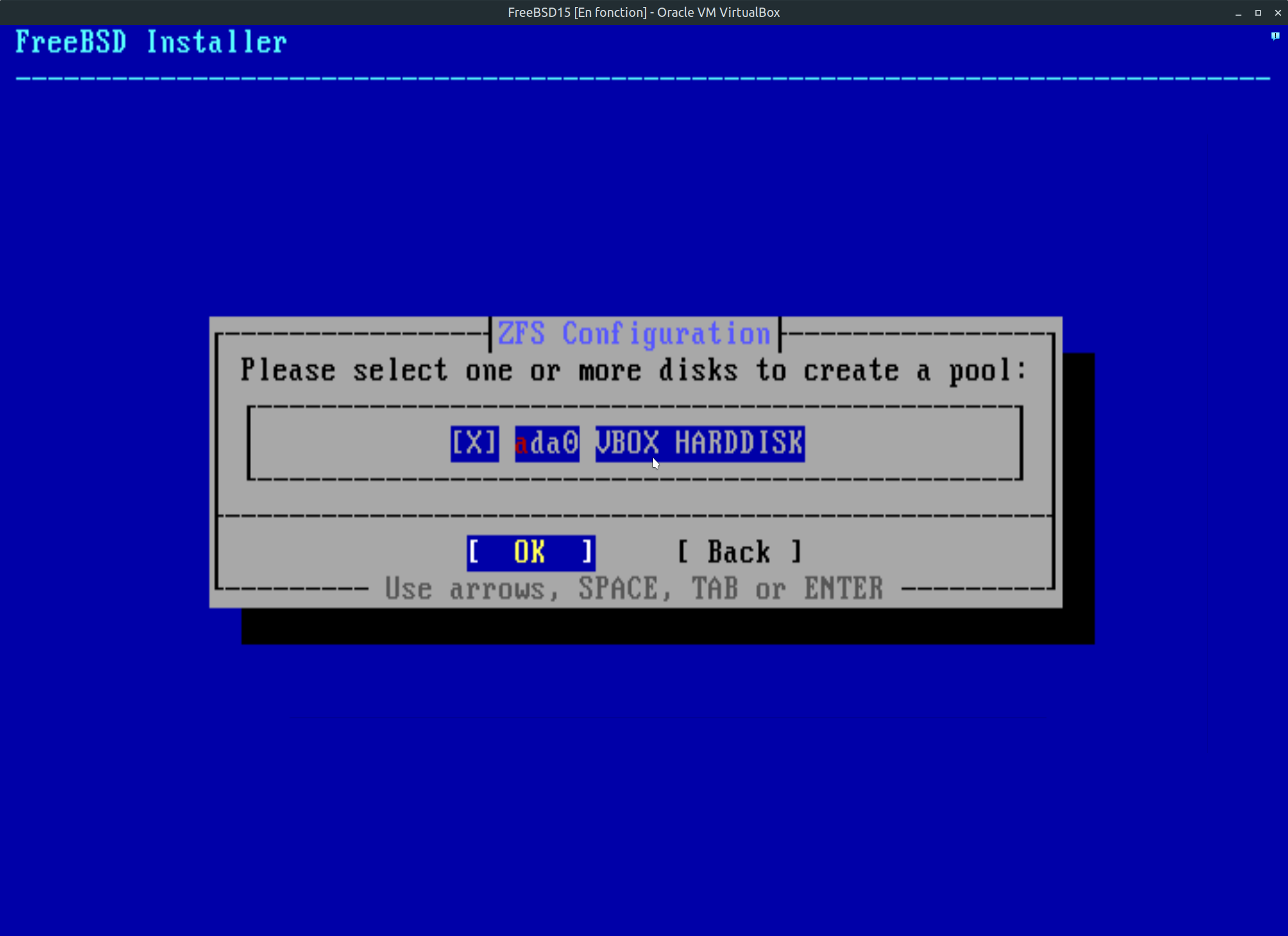 Étape 13: Maintenant que l'on a choisi le système de fichier du disque ZFS et la configuration par défaut, il vous reste à indiquer sur quel disque voulez-vous utiliser pour l'installation. Dans mon cas, j'ai un seul disque alors le choix est facile. Advenant le cas où vous avez 2,3 disque dur sur le PC, vous devez simplement vous positionner sur le disque que vous voulez utiliser. Utiliser la touche espace du clavier pour faire la sélection et faite entrée pour valider le choix.