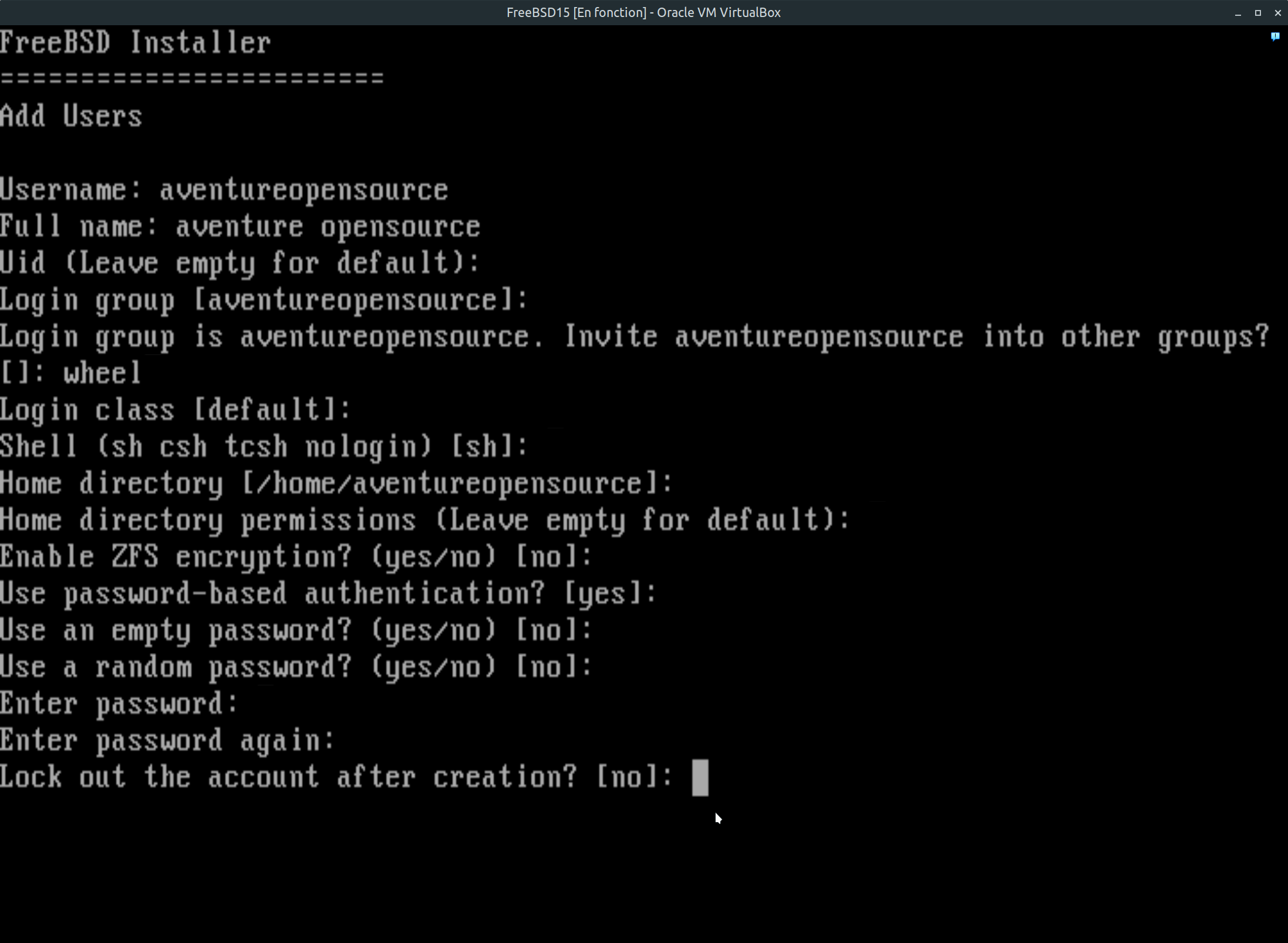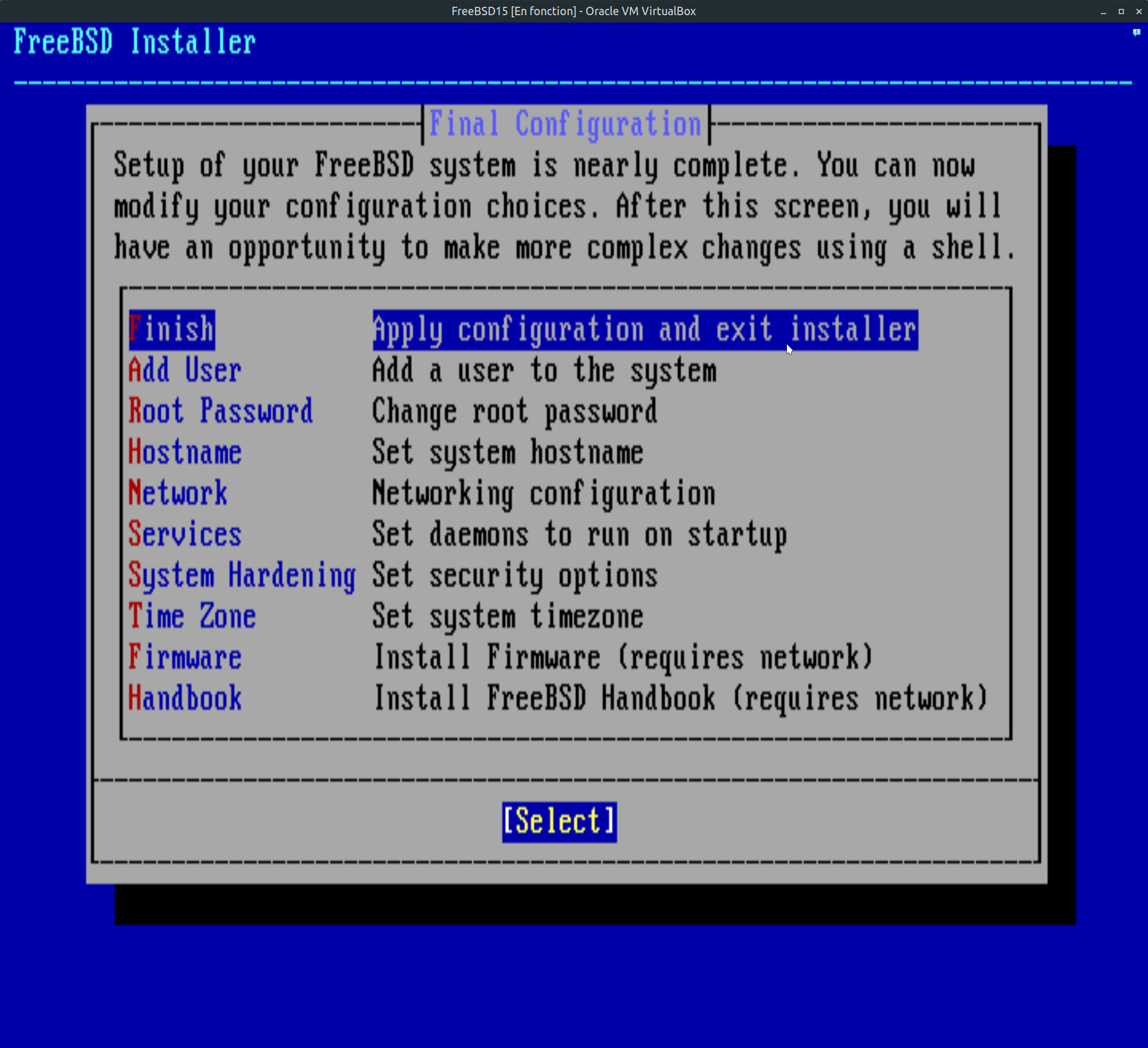 Étape 26: FreeBSD 15 pense à tout, une fois le premier compte utilisateur complété, le système d'installation vous redirige à la fenêtre contextuelle intitulé (Final Configuration). Ceci vous permet de retourner en arrière au cas où vous voulez refaire une des étapes de configuration. En principe, vous n'avez pas à refaire une ou l'autre des étapes. Faite entrée au clavier pour continuer.