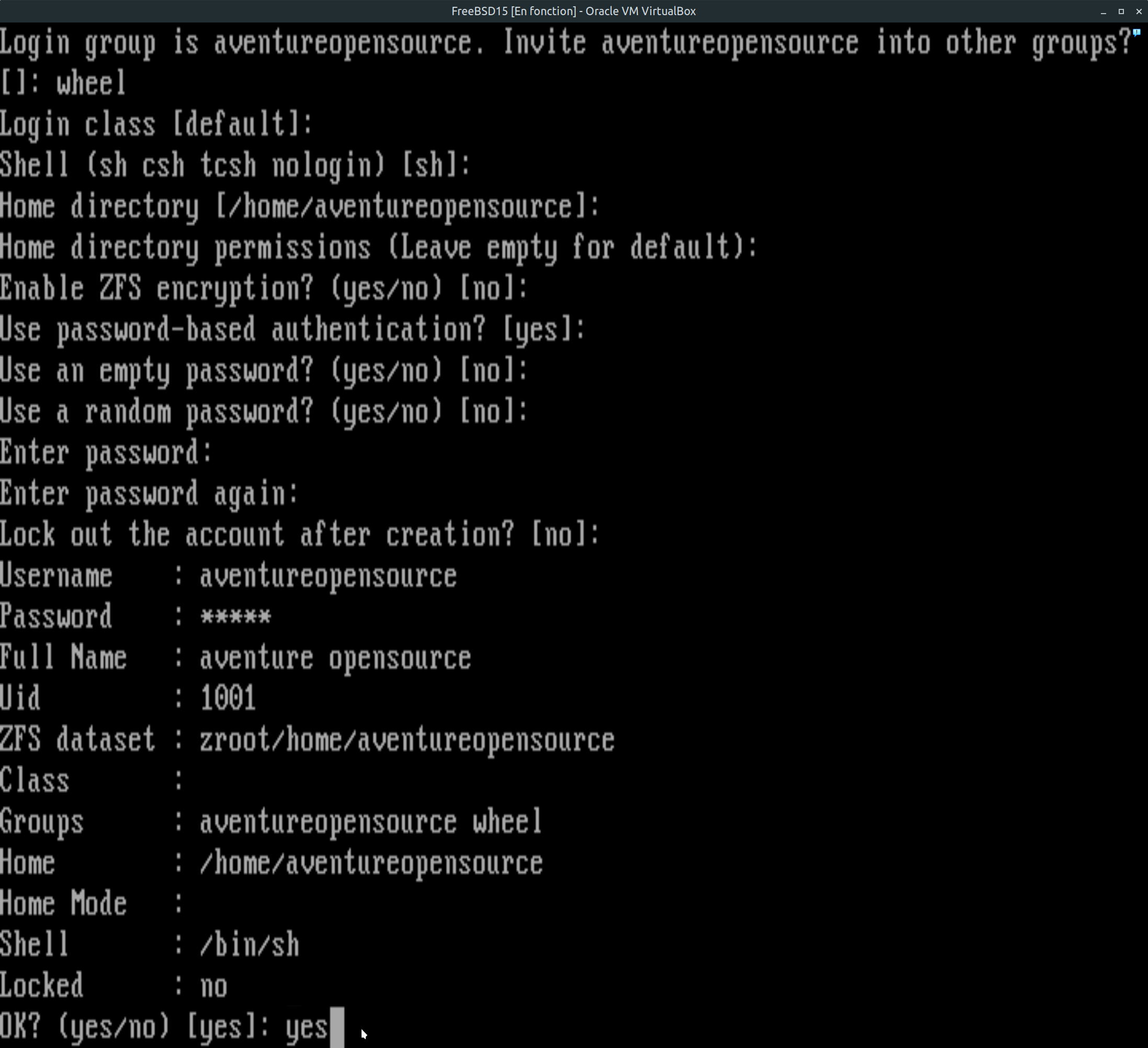 Étape 25: Le système est bien fait, vous n'avez qu'à suivre ligne par ligne qui se présente une à la suite de l'autre. En premier votre nom d'utilisateur. Une fois fait, cliquer sur entrée au clavier pour passer à la ligne suivante. Porter attention à la ligne * Login group * où vous devrez inscrire au minimum * wheel * pour être en mesure de gérer quelques services du système. Vous pourriez ajouter également * video *. Une fois que vous aurez complété l'ensemble des questions de création de l'utilisateur, vous devez écrire * yes * à la dernière question et taper entrée au clavier pour valider.