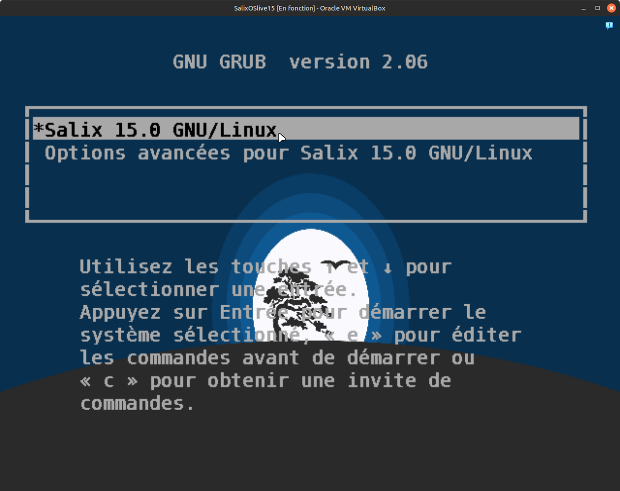 13. Nous avons réussi à effectué l'installation en mode graphique Live de SalixOS, lors du redémarrage vous allez voir normalement l'écran de démarrage de Grub qui est comme sur l'image ci-dessous. Vous avez simplement qu'à faire "entrer" sur votre clavier pour lancer le démarrage du système.