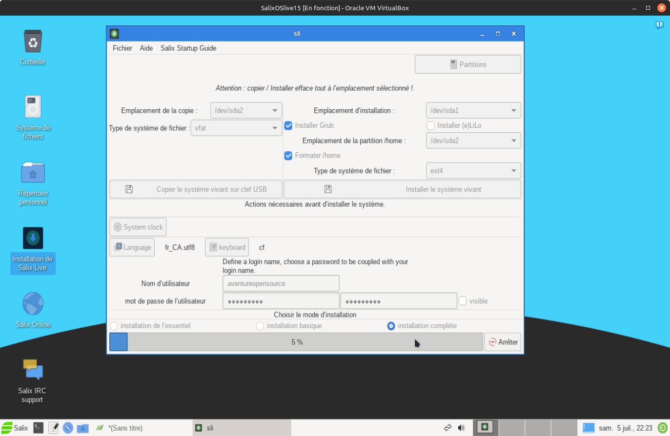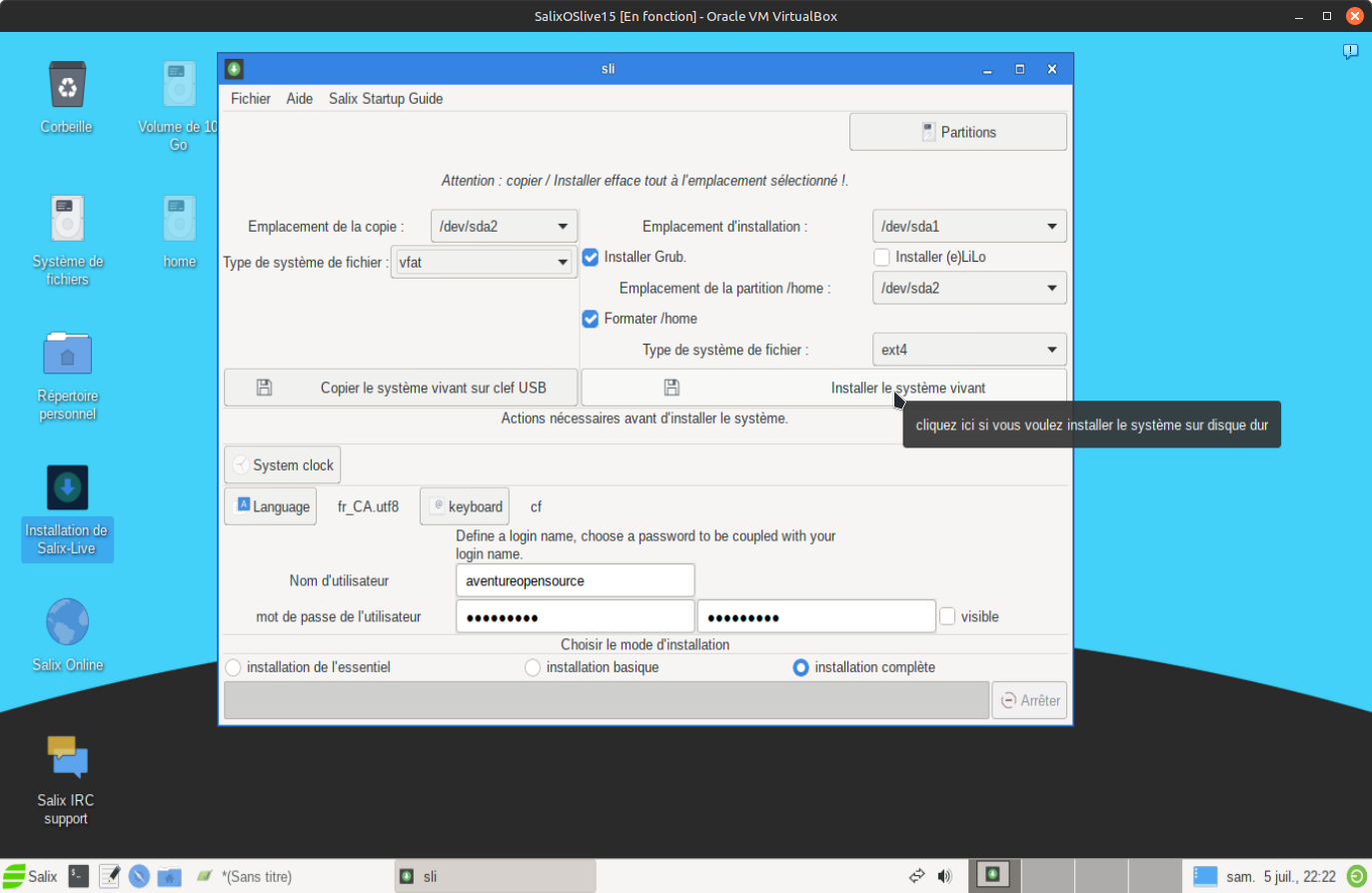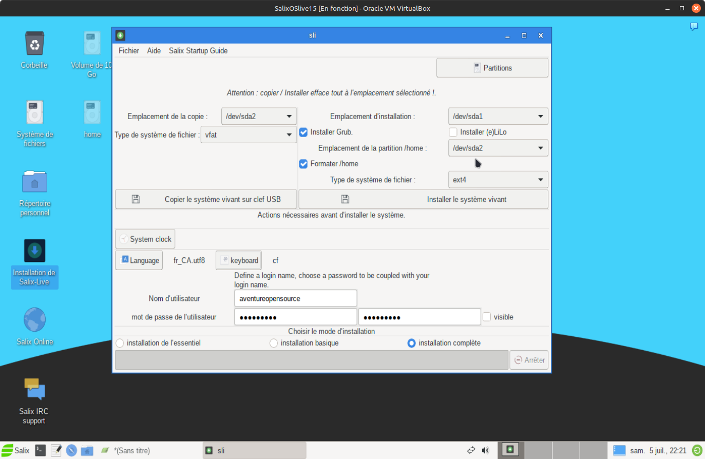 10. Toutes les étapes précédentes ont été accompli, maintement il vous reste simple à définir "Emplacement d'installation" est la partition racine du système alors sélectionner "sda1" ensuite dans "Emplacement de la partition /home" sélectionner "sda2" aussi vous pouvez ou non formater la partition /home. Dans mon cas, j'ai cliqué dans la case formater et le système de ficher par defaut est "EXT4". vous avez le choix en ce qui conserne le chargeur d'amorçage, ce qui n'est pas le cas sous l'installation en mode semi-graphique. Sélectionner cette fois-ci "installer Grub" car Grub est le chargeur d'amorçage le plus utilisé sous Linux. Il ne vous reste qu'à entrer votre nom d'utilisateur et votre mot passe répété dans les cases appropriées comme dans l'exemple ci-dessous.