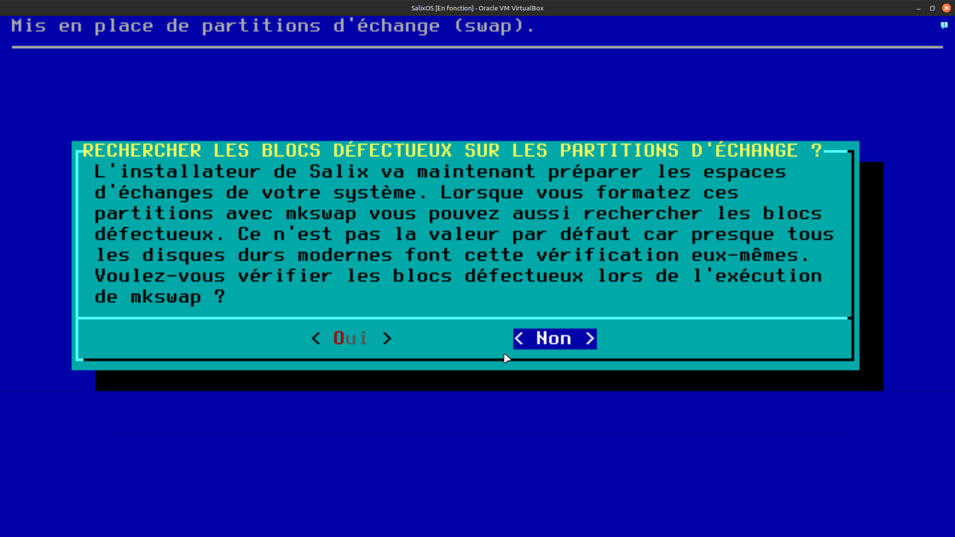 16.  Le programme d’installation vous demande de sélectionner la partition swap. Si vous voulez vérifier les blocks défectueux vous pouvez répondre "oui" sinon par défaut vous laisser sur "non"