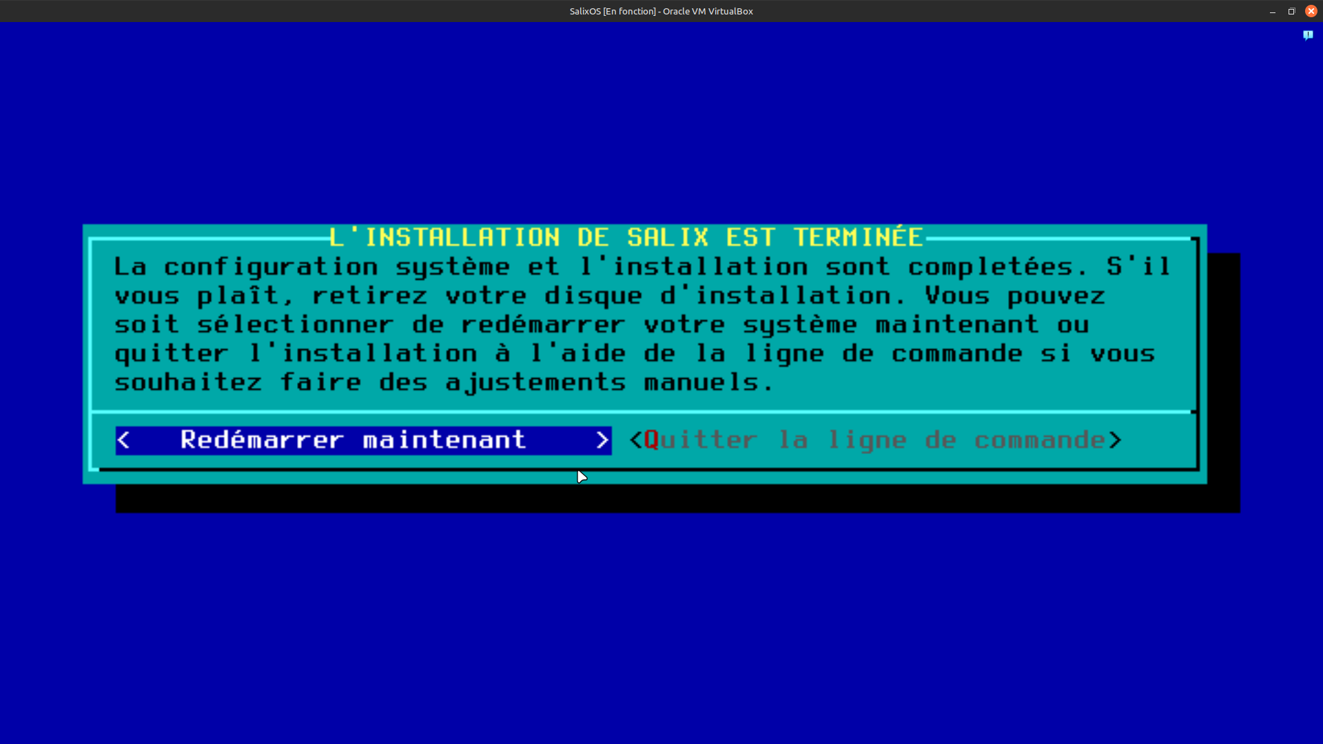44. Voilà! Vous avez enfin terminé l’installation de SalixOS. Appuyer sur la touche "entrée" pour redémarrer le système fraîchement installé.
