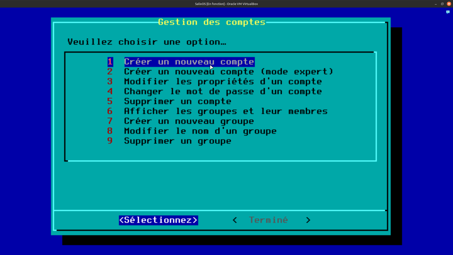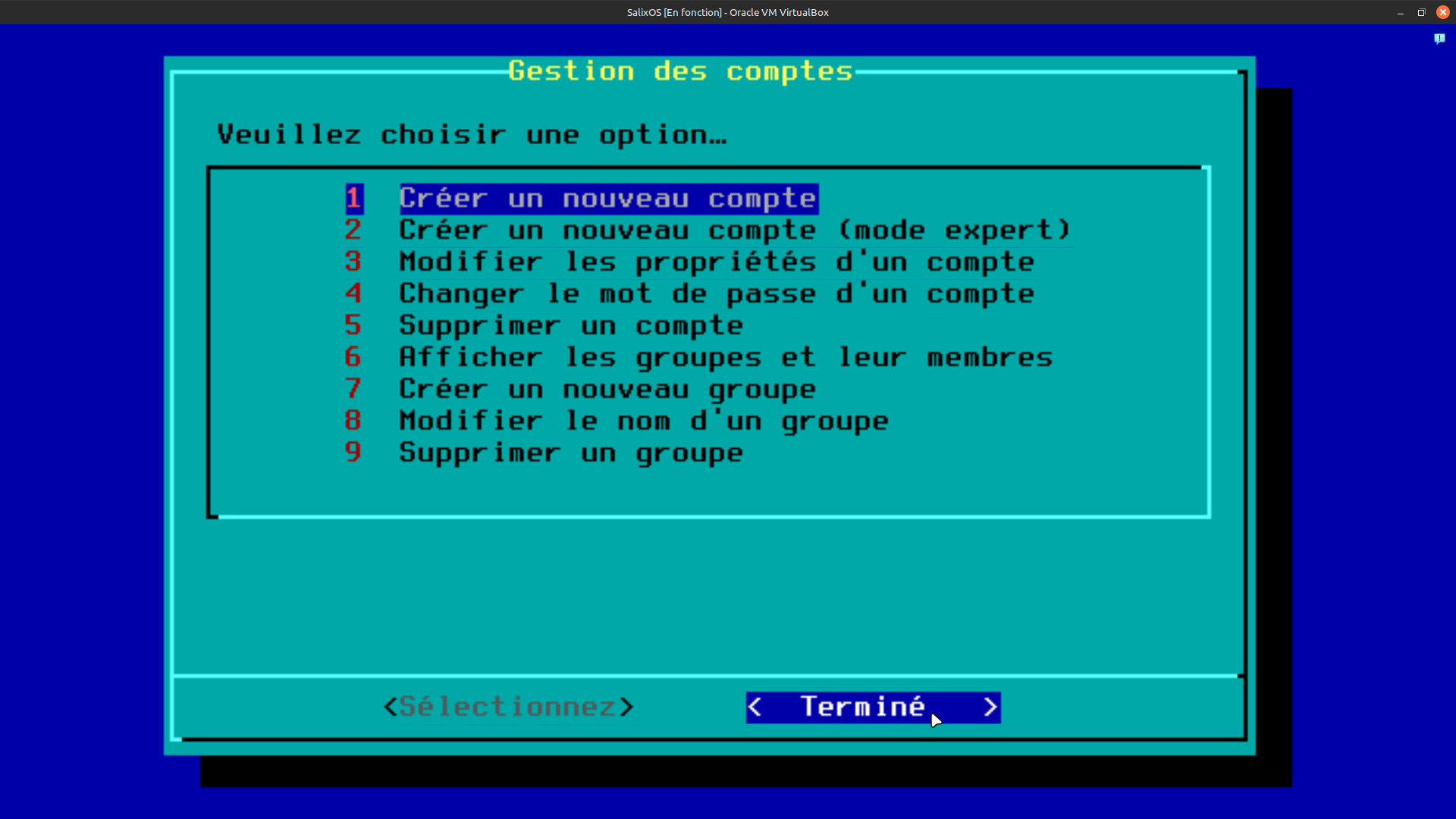42. Par défaut, le programme d’installation vous fait revenir sur la fenêtre de dialogue de gestion des comptes. Si vous êtes le seul utilisateur de l’ordinateur, vous n’avez qu’à vous déplacer sur le bouton "terminé". Dans le cas contraire, vous pouvez créer un ou des comptes supplémentaires.