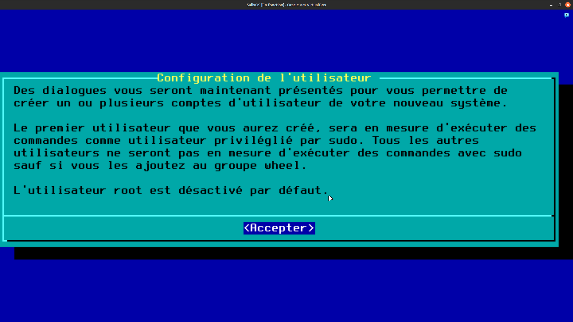 36. Vous voici maintenant à l'étape de créer le premier utilisateur qui aura les privilèges "root/adminstrateur" du système. Faite un clic sur la touche "entrée" pour accepter.